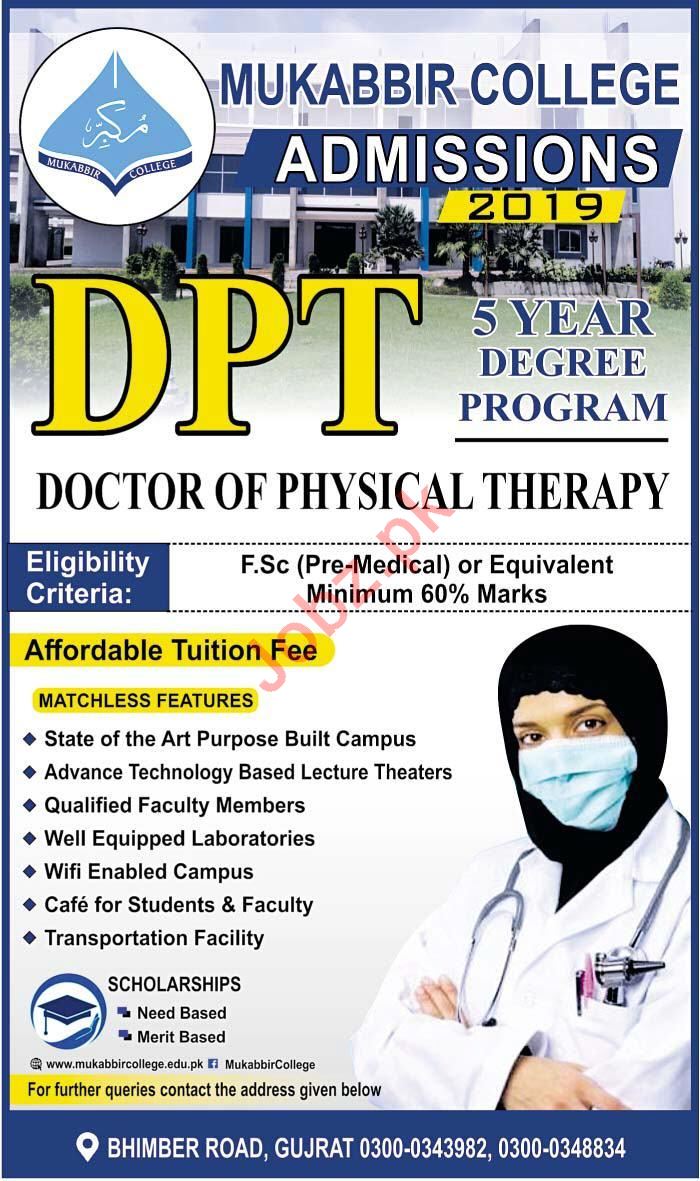 Mukkabir College is offering admissions in Doctor of Physical Therapy DPT 5 years degree program in Gujrat. Mukkabir College offers need bases and merit bases scholarships. Read newspaper ad for exact details.