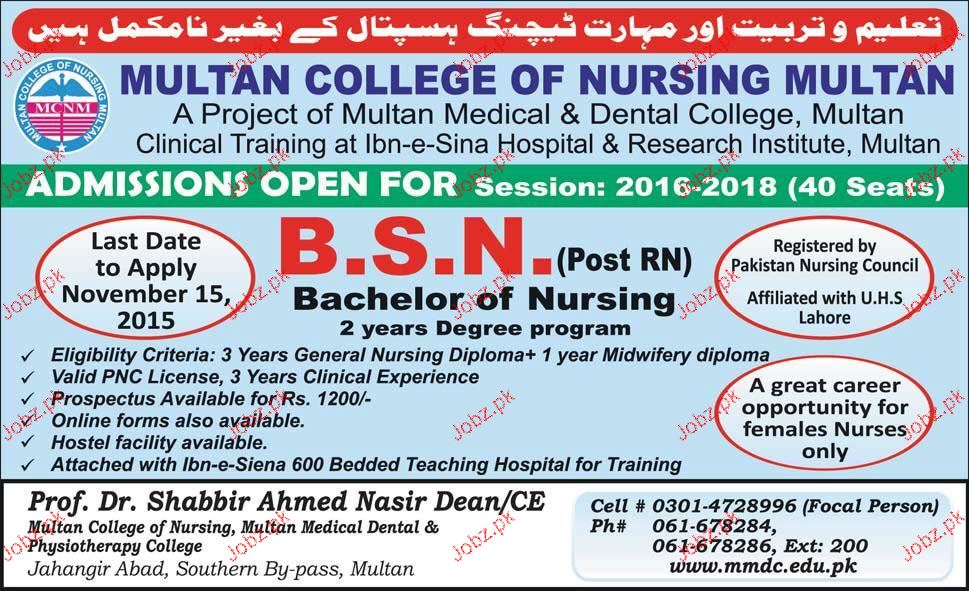 Multan College of Nursing Multan Admission in BSN in Multan. Read newspaper ad for exact details.