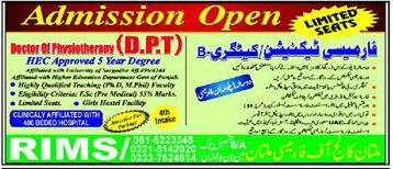Multan College of Pharmacy Multan, Pakistan announces admissions 2018 for the classes of Doctor of Physical Therapy DPT & Pharmacy Technician Category B. Read newspaper ad for exact details.