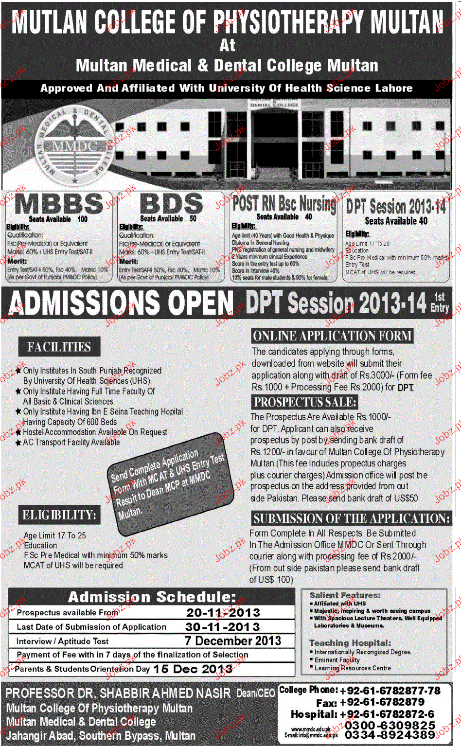 Multan College of Physiotherapy Multan Admission in MBBS and BDS in Multan Read newspaper ad for exact details.