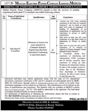 Multan Electric Power Company MEPCO jobs advertisement dated about 3 July 2022 in daily Nation Newspaper invites application for the vacant post of individual consultant in Multan, multan Punjab Pakistan. Preferred Education is BIT, MIT and Master etc.
