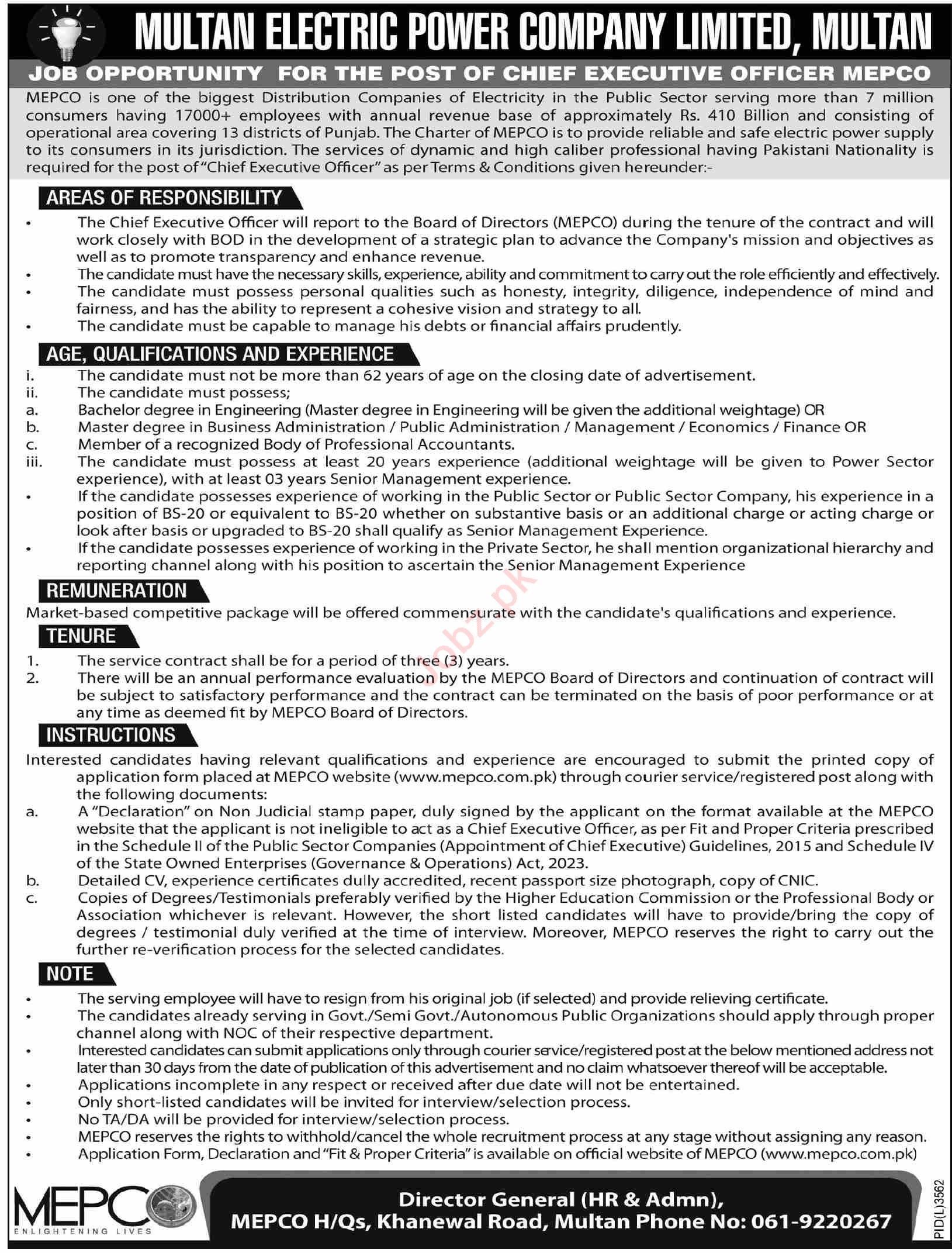 Multan Electric Power Company MEPCO Multan, multan Punjab Pakistan invites applications from eligible candidates for the post of chief executive officer as per advertisement of June 12, 2023 published in daily Dawn Newspaper. Educational qualifications required Bachelor, Master and MS etc.