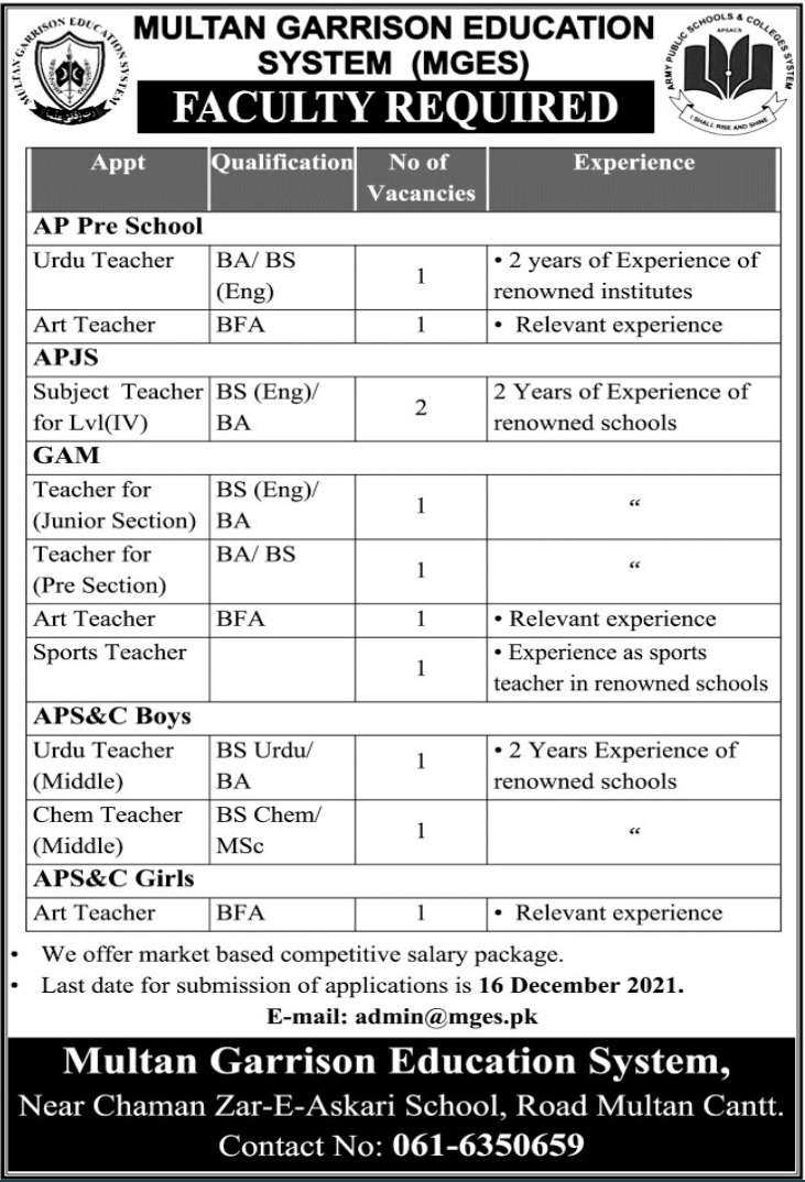 Vacancies in Multan Garrison Education System Advertisement December 2021