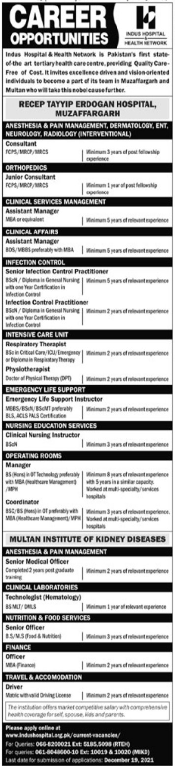 Indus Hospital and Health Network is hiring Consultant, Junior Consultant, Assistant Manager, Senior Infection Control Practioner, Infection Control Practitioner, Respiratory Therapist, Emergency Life Support Instructor, Clinical Nursing Instructor, Manager, Coordinator, Senior Medical Officer, Technologist, Senior Officer, Finance Officer, Driver in Multan Institute of Kidney Diseases and Recep Tayyip Erdogan Hospital Muzaffargarh.