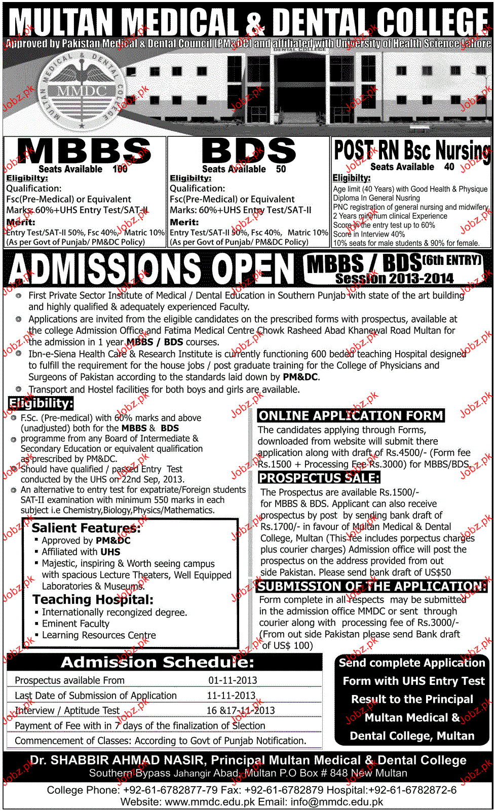 Multan Medical & Dental College Admission in MBBS and BDS in Multan Read newspaper ad for exact details.