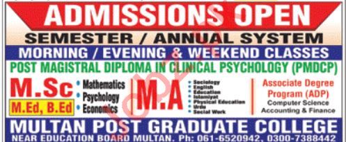 Multan Post Graduate has announced admissions in M.Sc Mathematics, Psychology, Economics, M.Ed, B.Ed, MA Sociology, English, Education, Islamiyat, Physical Education, Social Work, Associate Degree Program in Computer Science, Accounting and Finance in Multan, Read newspaper ad for exact details.