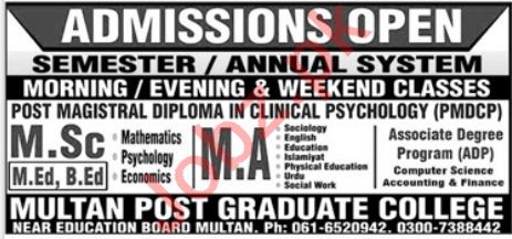 Multan Post Graduate College has announced admissions in M.Sc Mathematics, Psychology, Economics, MA Sociology, English, Education, Islamiyat, Physical Education, Urdu, Social Work, M.Ed, B.Ed, Associate Degree Program in Computer Science, Accounting and Finance in Multan. Read newspaper ad for exact details.