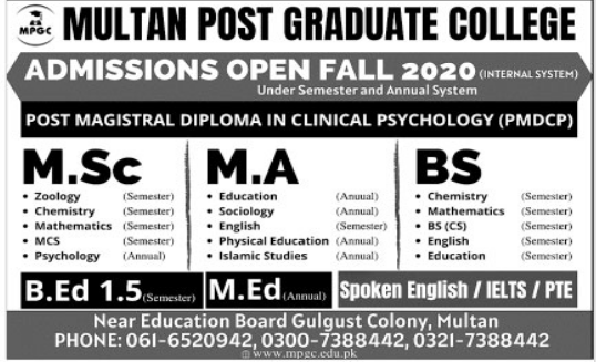Multan Post Graduate College has announced admissions in MSc Zoology, MSc Chemistry, MSc Mathematics, MSc Psychology, MA Education, MA Sociology, MA English, MA Physical Education, MA Islamic Studies, B.Ed and M.Ed. Read newspaper ad for exact details.
