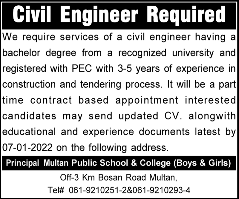 Latest Public School and College Engineering Posts Multan 2025