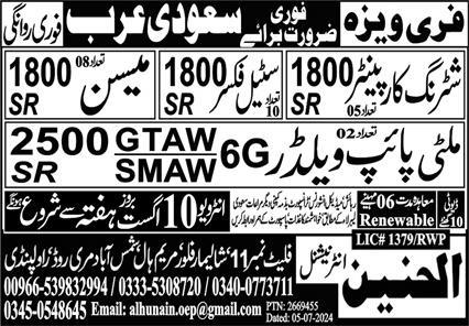 Al Hunain International jobs advertisement dated about 7 August 2024 in daily Express Newspaper invites application for the vacant post of 6g welder, steel fixer, shuttering carpenter, multi pipe welder, smaw welder, gtaw welder and mason in Taif, makkah Saudi Arabia. Persons with Intermediate, DAE and Matric etc. education can apply.