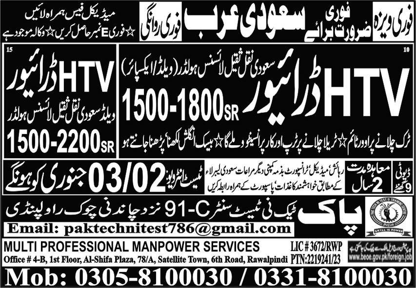 Latest Overseas jobs in Multi Professional Manpower Services in Driving and others can be applied till 3 January 2024 or as per closing date in newspaper ad. Read complete ad online to know how to apply on latest Multi Professional Manpower Services job opportunities. On job medical, transport and accommodation facility is provided.