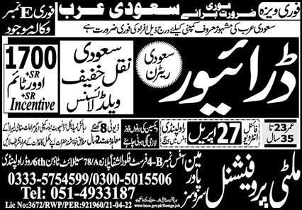 Multi Professional Manpower Services jobs advertisement dated about 24 April 2022 in daily Express Newspaper invites application for the vacant post of driver in saudi arabia Saudi Arabia. Educational qualifications required Matric and Intermediate etc.