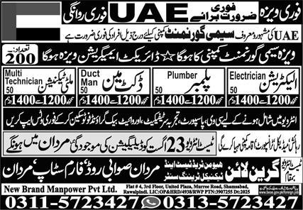 Green Line Human Trade Test & Technical Training Center is looking for candidates for following posts as per job advertisement published in daily Express Newspaper of August 23, 2025 for location Sharjah, abu dhabi UAE: