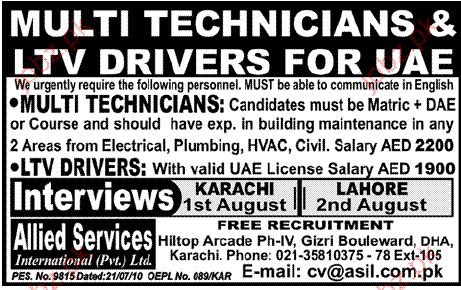 Multi Technicians & LTV Drivers required