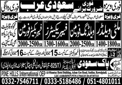 Pine Hills International is looking for candidates for following posts as per job advertisement published in daily Express Newspaper of July 15, 2023 for location Jeddah, dammam Saudi Arabia: