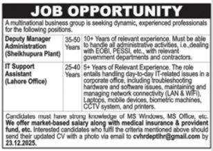 Multinational Company is looking for candidates for following posts as per job advertisement published in daily Jang Newspaper of December 14, 2025 for location Lahore, lahore Punjab Pakistan: