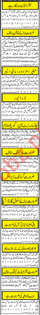 Experienced and strong persons for the posts of Security Guards, Teachers, Marketing Officer, Manager, Receptionist, Order Taker, Cook, Driver, Lady Searcher, Web Developer, Sales Officer, Labors, Sales agents required for a well known companies, school, hotel, restaurant, clinics in Islamabad Pakistan.