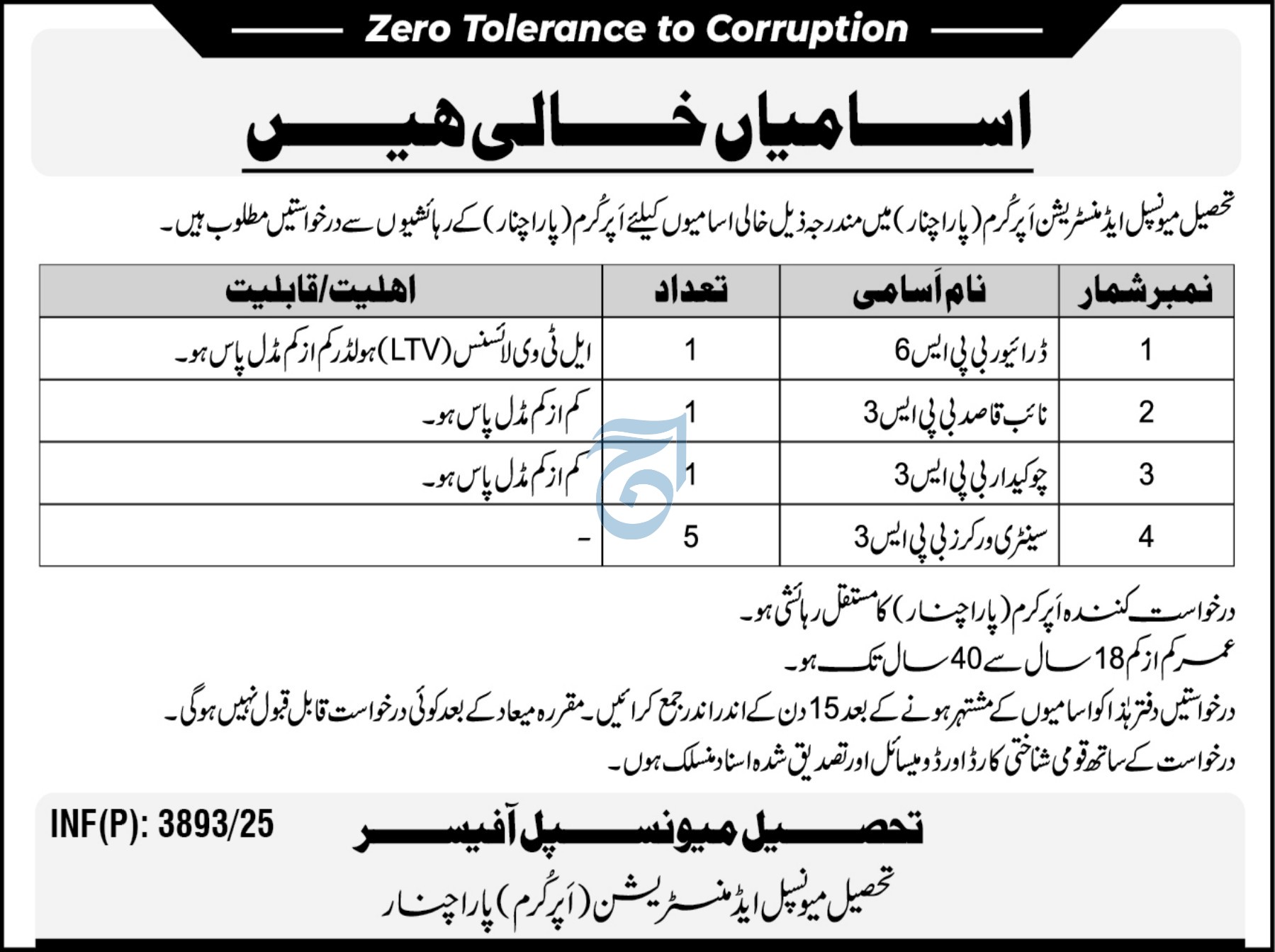 Municipal Administration jobs advertisement dated about 16 September 2025 in daily Aaj Newspaper invites application for the vacant post of naib qasid, driver, sanitary worker and chowkidar in Kurram, kurram Khyber Pakhtunkhwa KPK Pakistan. Candidates with Primary, Matric and Middle etc. educational background will be preferred.