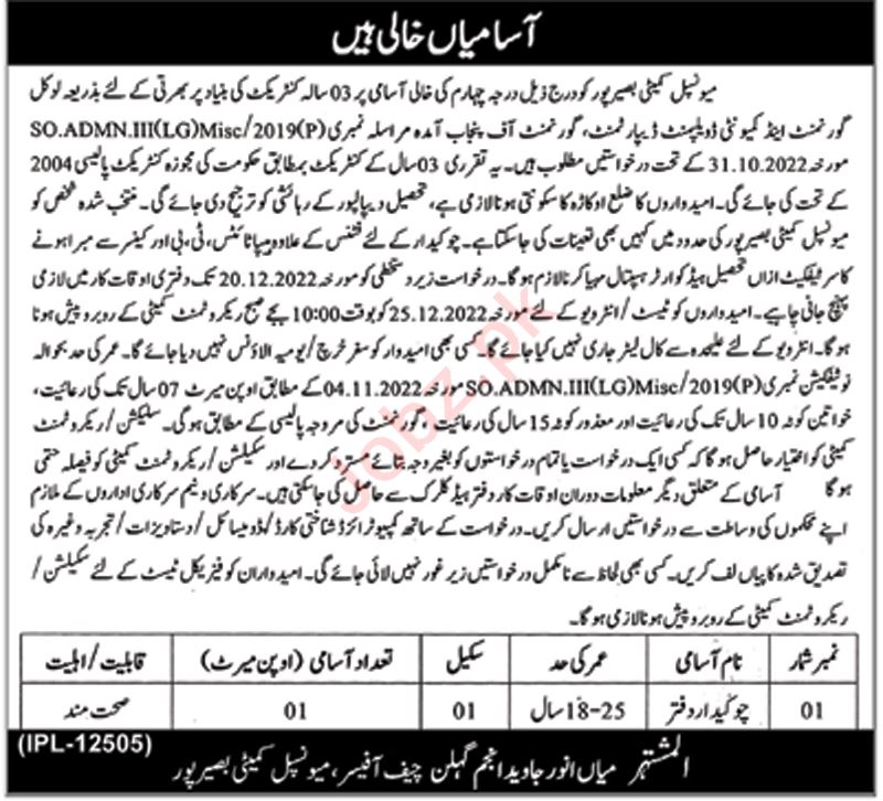Vacant posts including chowkidar are announced in Municipal Committee Okara, okara Punjab Pakistan as per 4 December 2022 advertisement in daily Nawaiwaqt Newspaper. Persons with Primary and Middle etc. education can apply.
