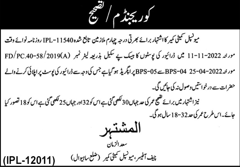 Municipal Committee is looking for candidates for following posts as per job advertisement published in daily Nawaiwaqt Newspaper of November 19, 2022 for location Sahiwal, sahiwal Punjab Pakistan: