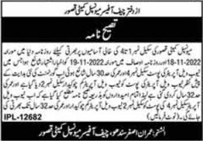 Vacant posts including tubewell operator cum chowkidar are announced in Municipal Committee Kasur, kasur Punjab Pakistan as per 7 December 2022 advertisement in daily Dunya Newspaper. Candidates with Middle and Matric etc. educational background will be preferred.