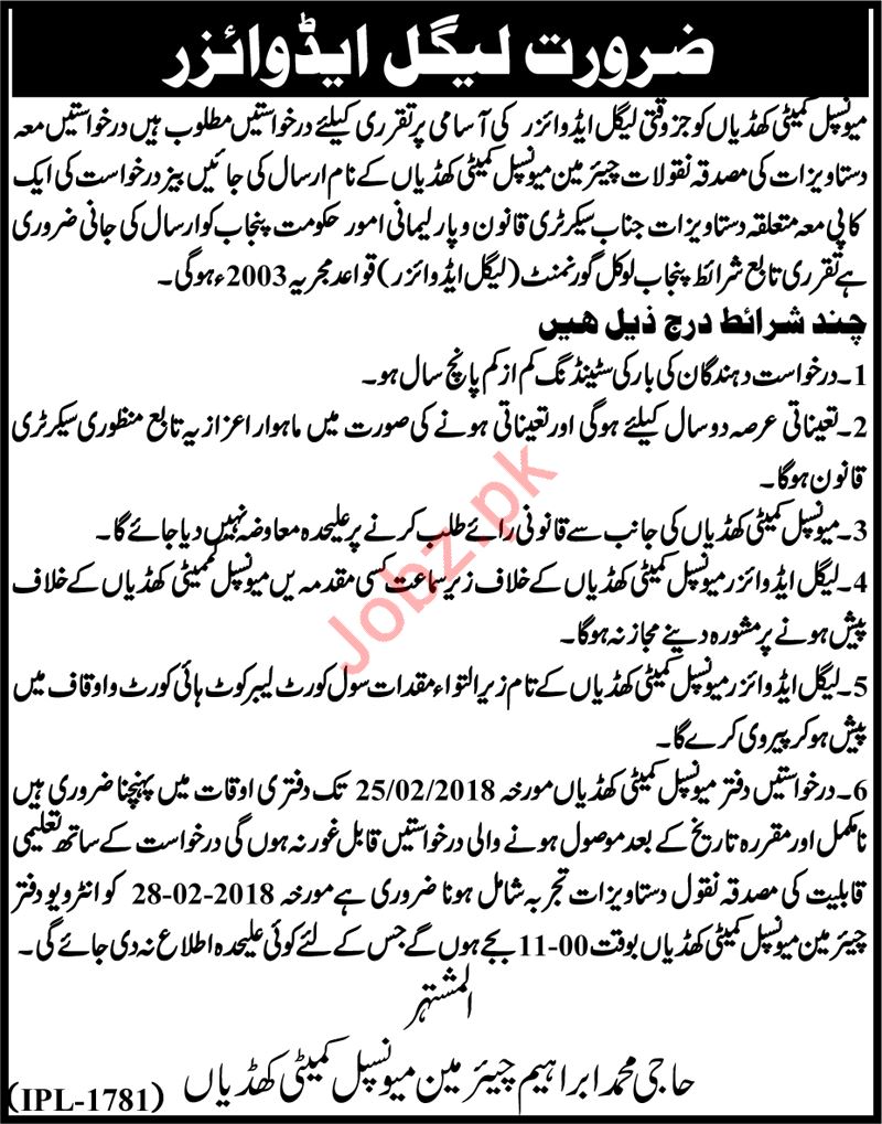Municipal Committee Khadian Jobs 2018 For Legal Advisor