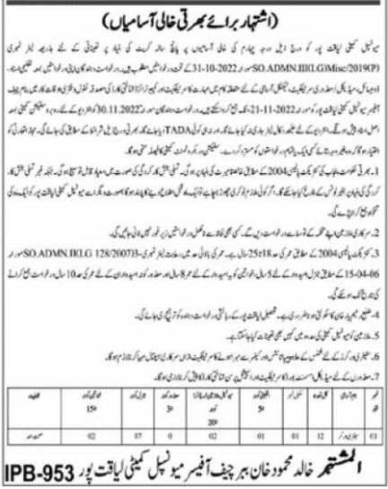 Vacant posts including sanitary worker are announced in Municipal Committee Rahim Yar Khan, rahim yar khan Punjab Pakistan as per 4 November 2022 advertisement in daily Daily Pakistan Newspaper. Preferred Education is Primary and Middle etc.