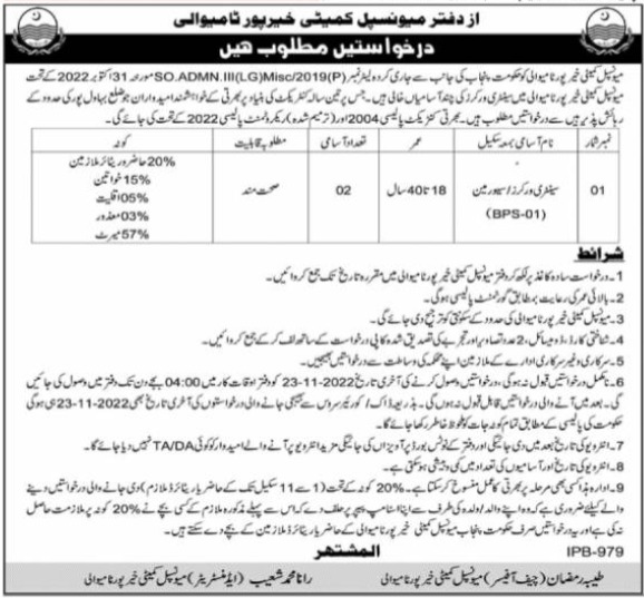 Municipal Committee is looking for candidates for following posts as per job advertisement published in daily Nawaiwaqt Newspaper of November 9, 2022 for location Multan, multan Punjab Pakistan: