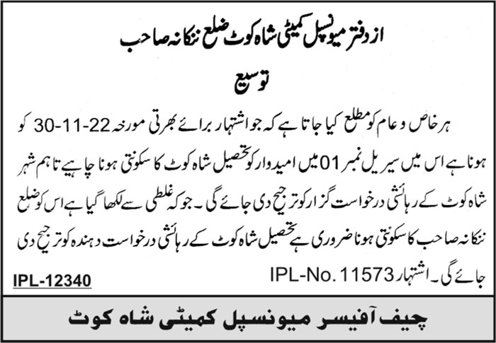 Vacant posts including class i to iv staff are announced in Municipal Committee Shahkot, shahkot Punjab Pakistan as per 29 November 2022 advertisement in daily Roznama 92 News Newspaper. Educational qualifications required Middle, Primary and Matric etc.