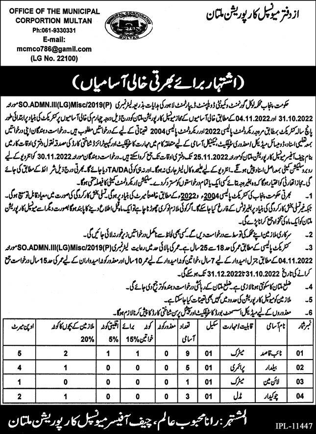 Local Government and Community Development Department, Municipal Corporation invites applications for job positions advertised in daily Express dated 9 November 2022 for following vacancies in Multan, multan Punjab Pakistan.