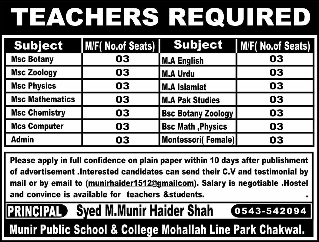 Latest Munir Public High School & College Teaching Posts Chakwal 2025