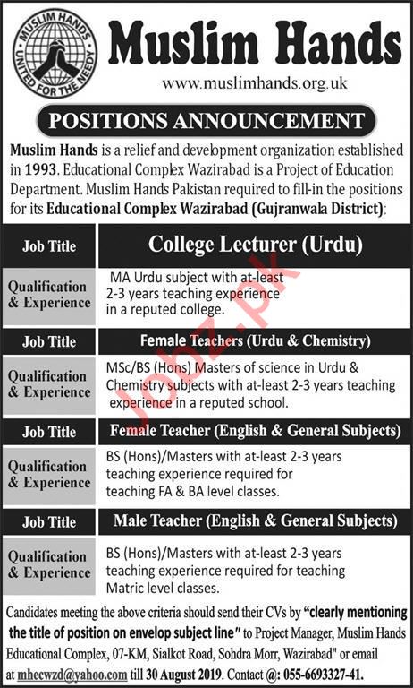 Muslim Hands Educational Complex Wazirabad NGO Jobs 2019