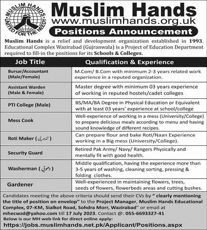 Muslim Hands invites applications for job positions advertised in daily Express dated 15 July 2023 for following vacancies in Wazirabad, wazirabad Punjab Pakistan.