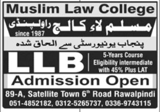 Muslim Law College LLB admissions 2022 has been announced. Muslim Law College Rawalpindi Punjab Pakistan welcomes students to apply for admissions in academic year 2022 in Other College. Students for admissions in LLb & criteria can apply as per Private institute admission policy 2022 before closing date March 6, 2022 as per advertisement. Read newspaper ad for exact details.