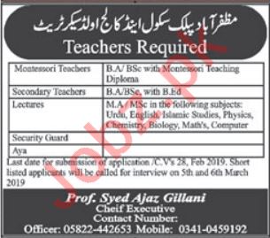 Montessori Teacher, Secondary Teacher, Urdu Lecturer, English Lecturer, Islamic Studies Lecturer, Physics Lecturer, Chemistry Lecturer, Biology Lecturer, Math Lecturer, Computer Lecturer, Security Guard and Aya Jobs at Muzaffarabad Public School And College in Muzaffarabad.