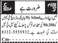 My School invites applications for job positions advertised in daily Jang dated 12 September 2024 for following vacancies in Quetta, quetta Balochistan Pakistan.
