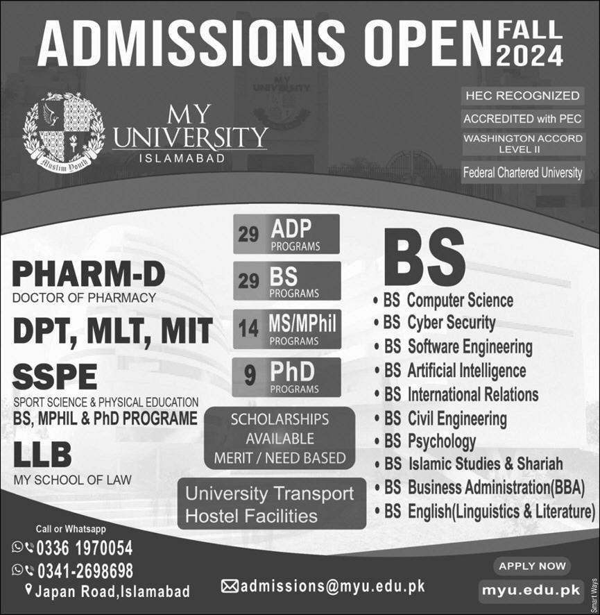MY University Doctor of Pharmacy, MLT, MIT, SSPE, International Relations, Civil Engineering, Artificial Intelligence admissions 2024 has been started. MY University Islamabad Islamabad Pakistan welcomes students to apply for admissions in academic year 2024 in Teaching University. Eligible candidates for admissions in ADP, DPT, BS, Mphil and Phd can apply as per Private institute criteria and before closing date 20 October 2024 after reading advertisement online. Read newspaper ad for exact details.