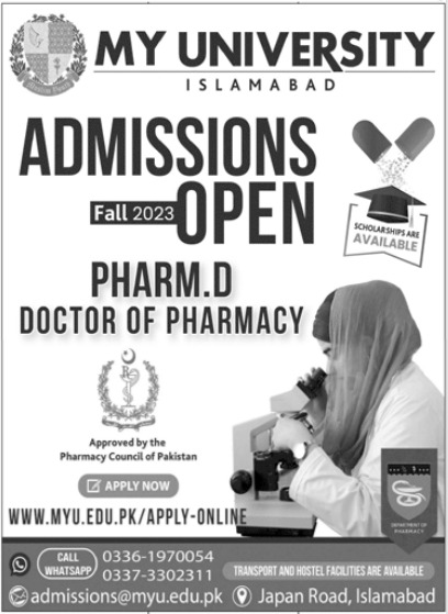 MY University Pharm D, Doctor of Pharmacy admissions 2023 has been announced. Eligible students can apply for academic admissions 2023 in MY University Islamabad Islamabad Pakistan for Medical University. Eligible candidates for admissions in Pharm D can apply as per Private institute criteria and before closing date 11 December 2023 after reading advertisement online. Read newspaper ad for exact details.