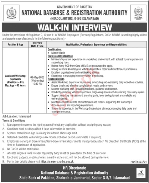 National Database & Registration Authority NADRA jobs advertisement dated about 24 March 2025 in daily Jang Newspaper invites application for the vacant post of assistant workshop supervisor in G-5 Islamabad, islamabad Islamabad Pakistan. Bachelor and Master etc. educational qualification will be preferred.