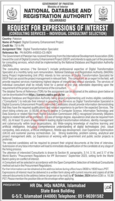 Latest Government jobs in National Database & Registration Authority NADRA in Consultant and others can be applied till 6 October 2024 or as per closing date in newspaper ad. Read complete ad online to know how to apply on latest National Database & Registration Authority NADRA job opportunities.