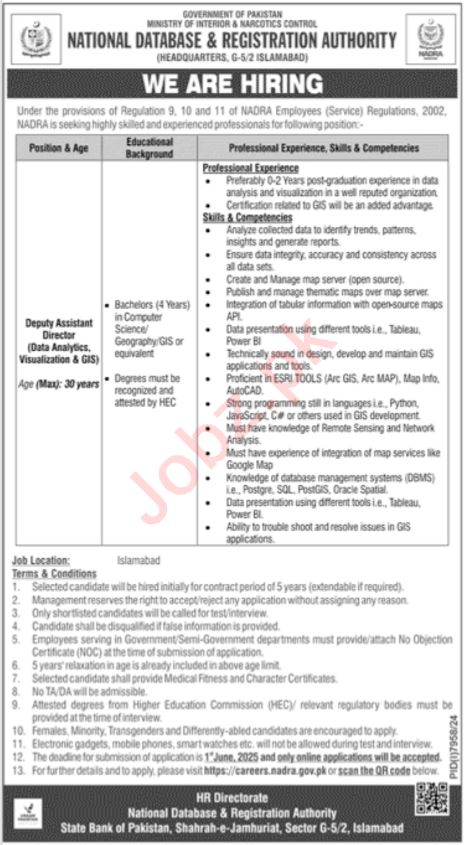 Vacant posts including deputy assistant director data analytics visualization are announced in National Database & Registration Authority NADRA G-5 Islamabad, islamabad Islamabad Pakistan as per 18 May 2025 advertisement in daily Jang Newspaper. Master and Bachelor etc. educational qualification will be preferred.