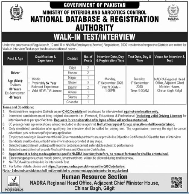 Latest National Database & Registration Authority NADRA Driving Posts Gilgit 2025
