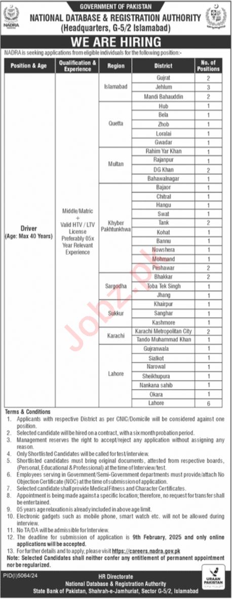 Latest Government jobs in National Database & Registration Authority NADRA in Driving and others can be applied till 9 February 2025 or as per closing date in newspaper ad. Read complete ad online to know how to apply on latest National Database & Registration Authority NADRA job opportunities.