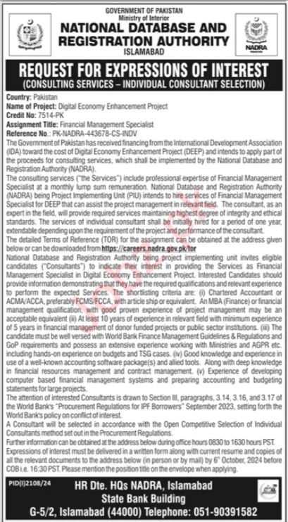 National Database & Registration Authority NADRA jobs advertisement dated about 22 September 2024 in daily Jang Newspaper invites application for the vacant post of consultant, individual consultant and financial management specialist in Islamabad, islamabad Islamabad Pakistan. Persons with Master and Bachelor etc. education can apply.