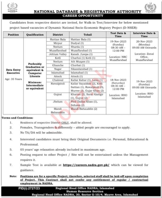 National Database & Registration Authority NADRA Islamabad, nagar valley, attock, mandi bahauddin, muzaffarabad, jhelum valley, gujrat, chakwal, jhelum, mirpur and neelum valley Islamabad Pakistan invites applications from eligible candidates for the post of data entry executive as per advertisement of November 5, 2023 published in daily Jang Newspaper. Intermediate and Bachelor etc. educational qualification will be preferred.