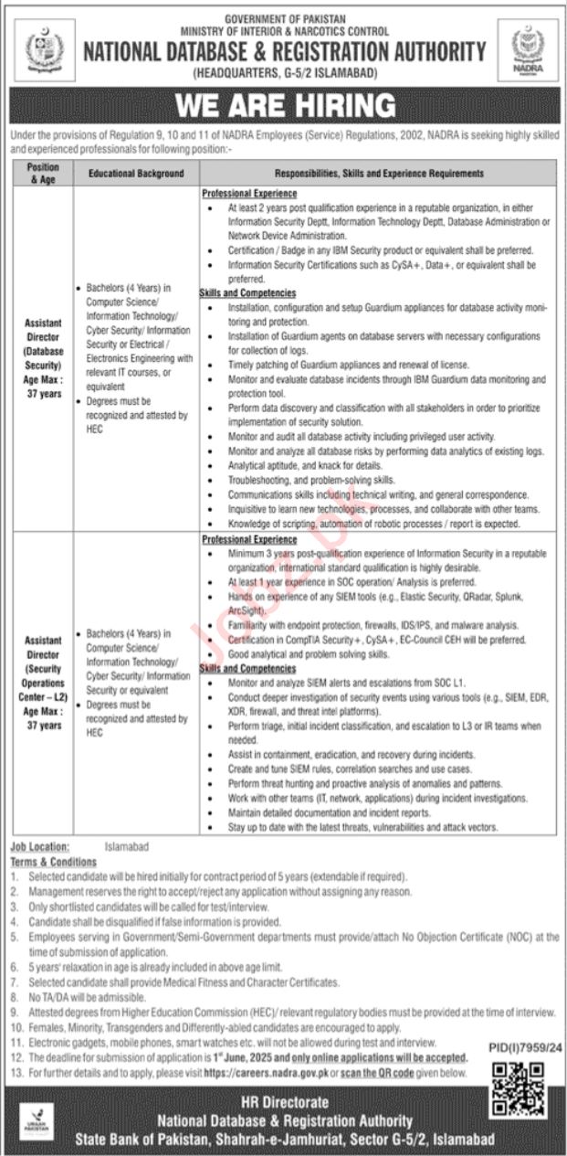 National Database & Registration Authority NADRA is looking for candidates for following posts as per job advertisement published in daily Jang Newspaper of May 18, 2025 for location G-5 Islamabad, islamabad Islamabad Pakistan: