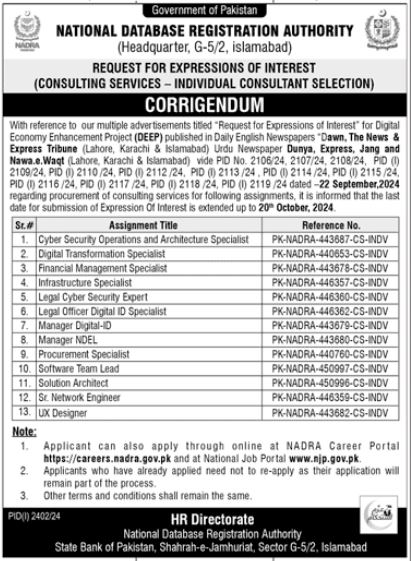 National Database & Registration Authority NADRA is looking for candidates for following posts as per job advertisement published in daily Jang Newspaper of October 5, 2024 for location Islamabad, islamabad Islamabad Pakistan: