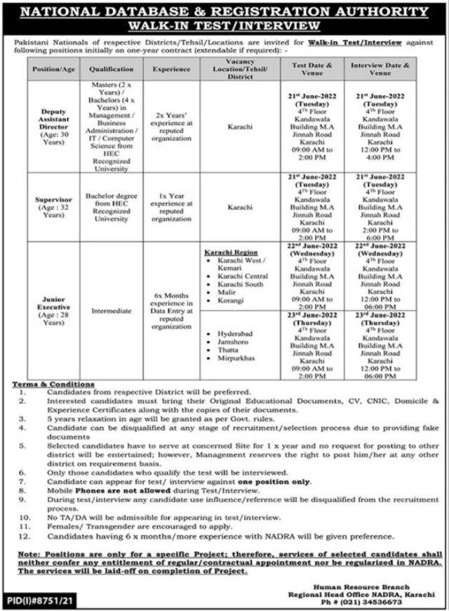 National Database & Registration Authority NADRA is looking for candidates for following posts as per job advertisement published in daily The News Newspaper of June 13, 2022 for location Karachi, karachi, thatta, jamshoro, hyderabad and mirpur khas Sindh Pakistan: