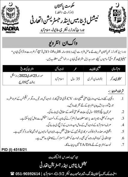 National Database & Registration Authority NADRA Islamabad Islamabad Pakistan invites applications from eligible candidates for the post of Sanitary Worker as per advertisement of January 5, 2022 published in daily Express Newspaper. Preferred Education is Primary etc.