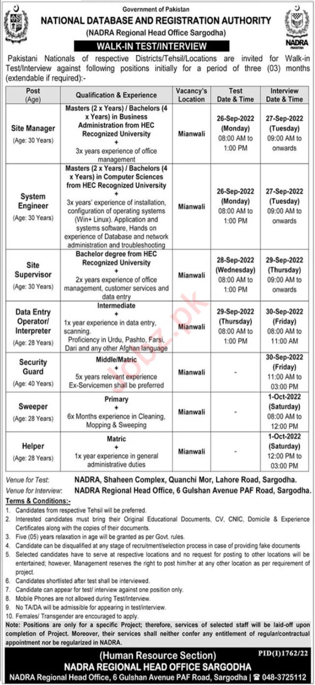 National Database & Registration Authority NADRA Sargodha, sargodha Punjab Pakistan invites applications from eligible candidates for the post of system engineer, sweeper, site supervisor, site manager, helper, data entry operator and security guard as per advertisement of September 19, 2022 published in daily The News Newspaper. Candidates with Matric, MS, Intermediate, Bachelor and Master etc. educational background will be preferred.